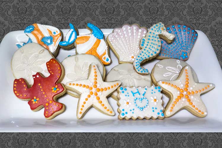 These 3-to-4-inch fancy Shortbread beach cookies are full of buttery flavor that melts in your mouth. They are decorated with a mixture of homemade marshmallow fondant and white sculpting chocolate with royal icing accents. The glazed beach cookies are my Classic Sugar Cookie recipe, frosted with vanilla-bean glaze and embellished with sweet accents.